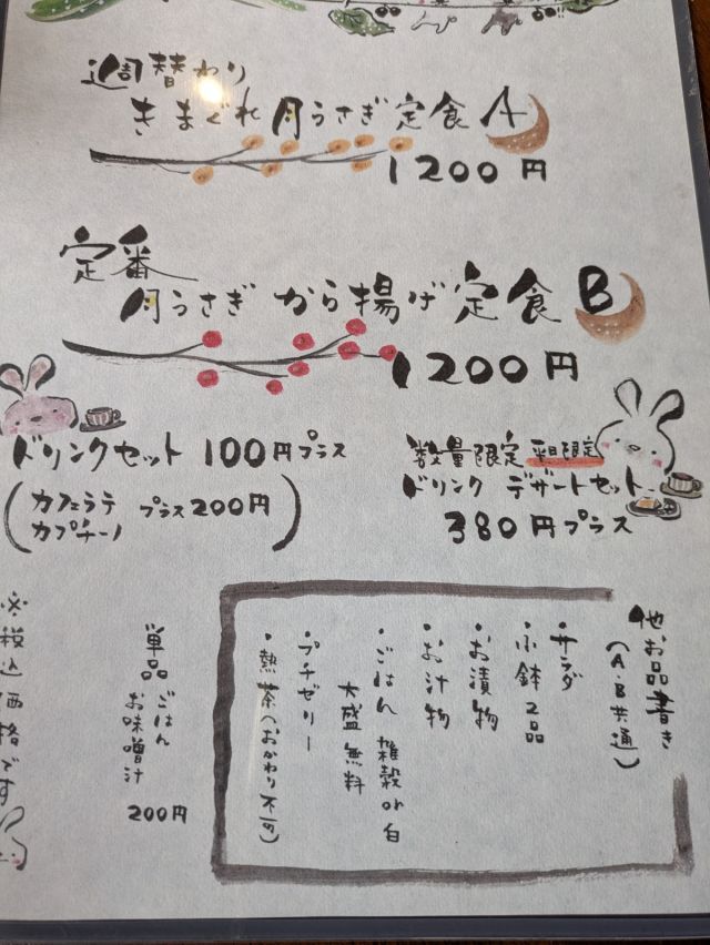 | オススメ | ・きまぐれ月うさぎ定食A 1,000円 ・月うさぎ唐揚げ定食B 1,000円 |